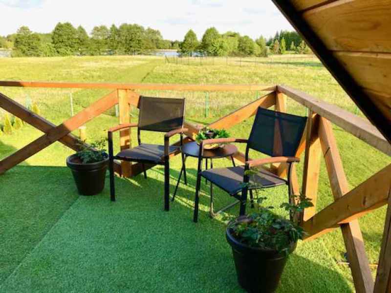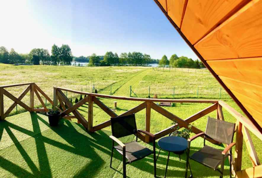 Z pokoju sypialni jest wyjście na ogromny taras z widokiem na jezioro Białe, na którym stoi stolik i krzesła)